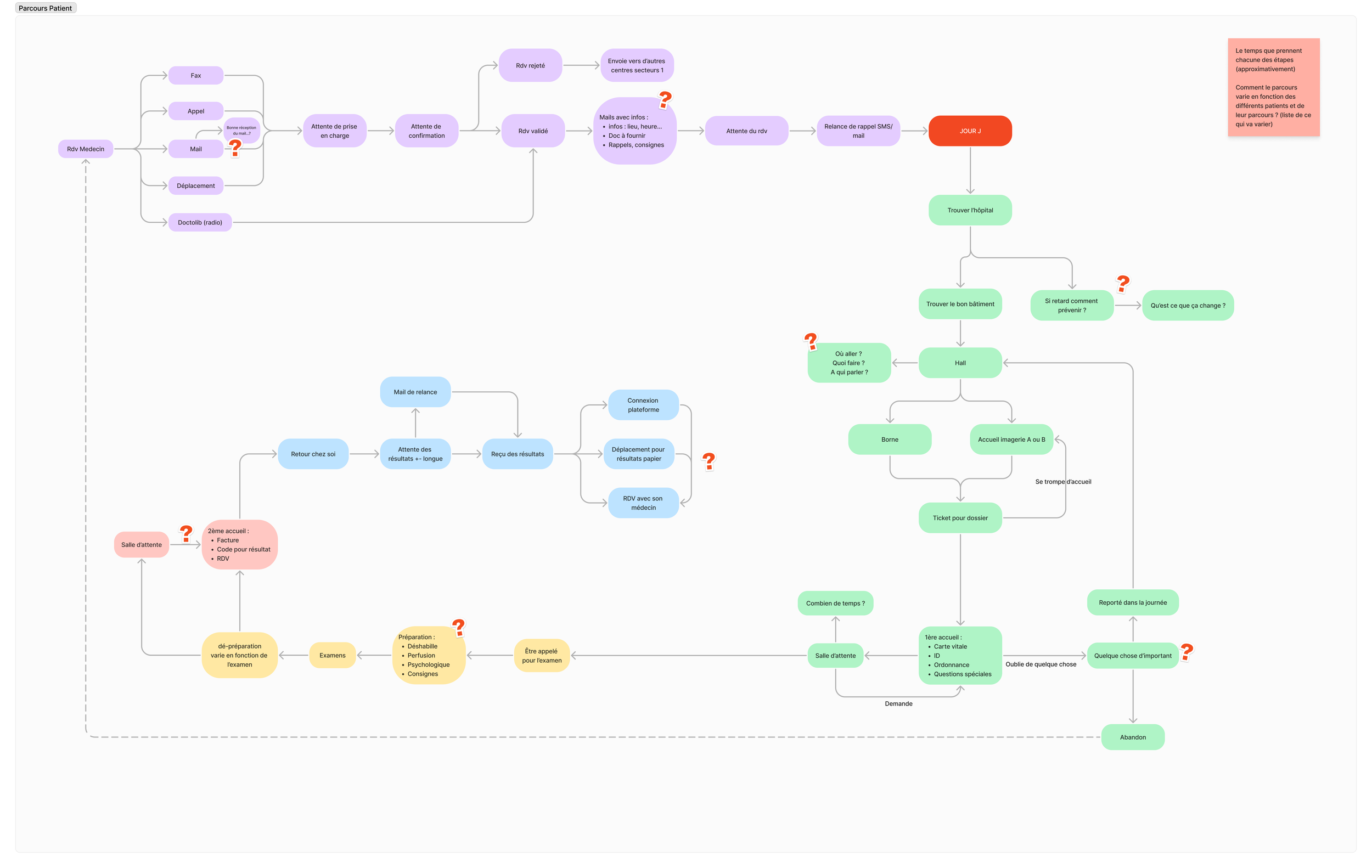 Pour notre projet, nous avons choisi de cibler les nouveaux patients externes de l'hôpital venant pour un rendez-vous en imagerie. Nous avons positionné notre action entre la confirmation du rendez-vous et la prise en charge par une assistante médicale.