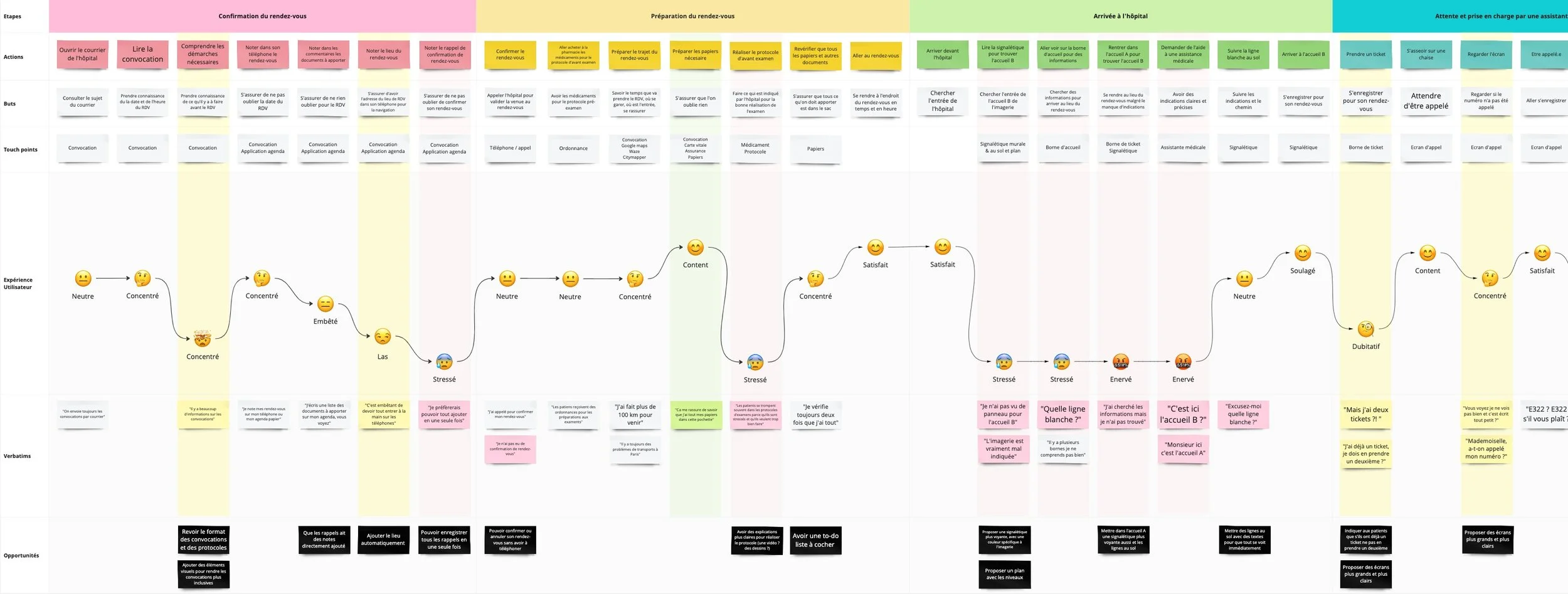 Afin d’identifier leurs besoins, les obstacles qu’ils rencontrent, et de révéler des opportunités, nous avons construit une user journey basée sur les interviews réalisées. Cette démarche nous a également guidées dans la formulation de notre problématique.