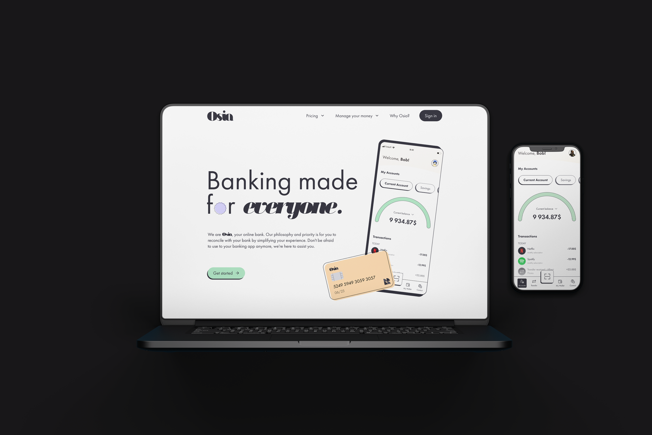 Nous avions pour consigne de concevoir une application bancaire ainsi qu'un site vitrine pour une banque. On nous a fourni des wireframes low-fi, comprenant les principales fonctionnalités de l'application et les informations clés à afficher sur la page vitrine.